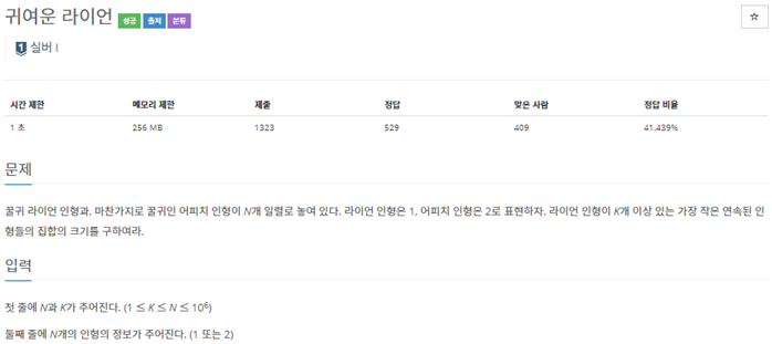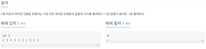 꿀귀 라이언 인형과, 마찬가지로 꿀귀인 어피치 인형이 N개 일렬로 놓여 있다. 라이언 인형은 1, 어피치 인형은 2로 표현하자. 라이언 인형이 K개 이상 있는 가장 작은 연속된 인형들의 집합의