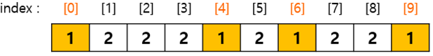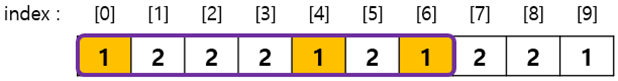 지정된 범위의 개수는 배열의 index 번호와 관련이 있습니다. index 0 ~ 6의 개수를 구하는 경우 범위 끝(end:6)-범위 시작(start:0)+1의 식을 적용하면 해당 범위의 원소 개수를 구할 수 있습니다. 따라서 1이 담겨있는 배열의 index만 따로 추려 ArrayList에 저장합니다.
