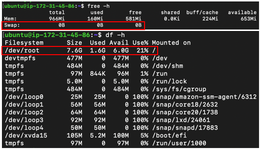 Swap 메모리를 늘리기 전 Swap 메모리는 할당된 공간이 없고 디스크는 1.6G(21%)정도 사용