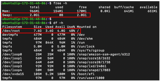 작업 후 Swap 메모리 및 디스크 용량 확인