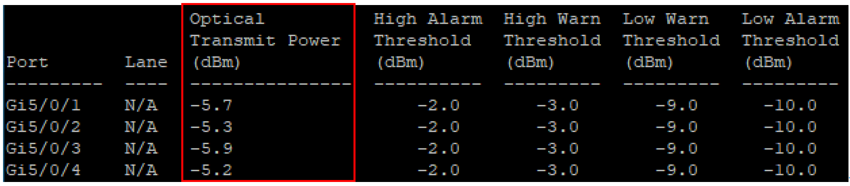 광 포트 지빅 신호 세기 확인: `show interfaces transceiver detail`