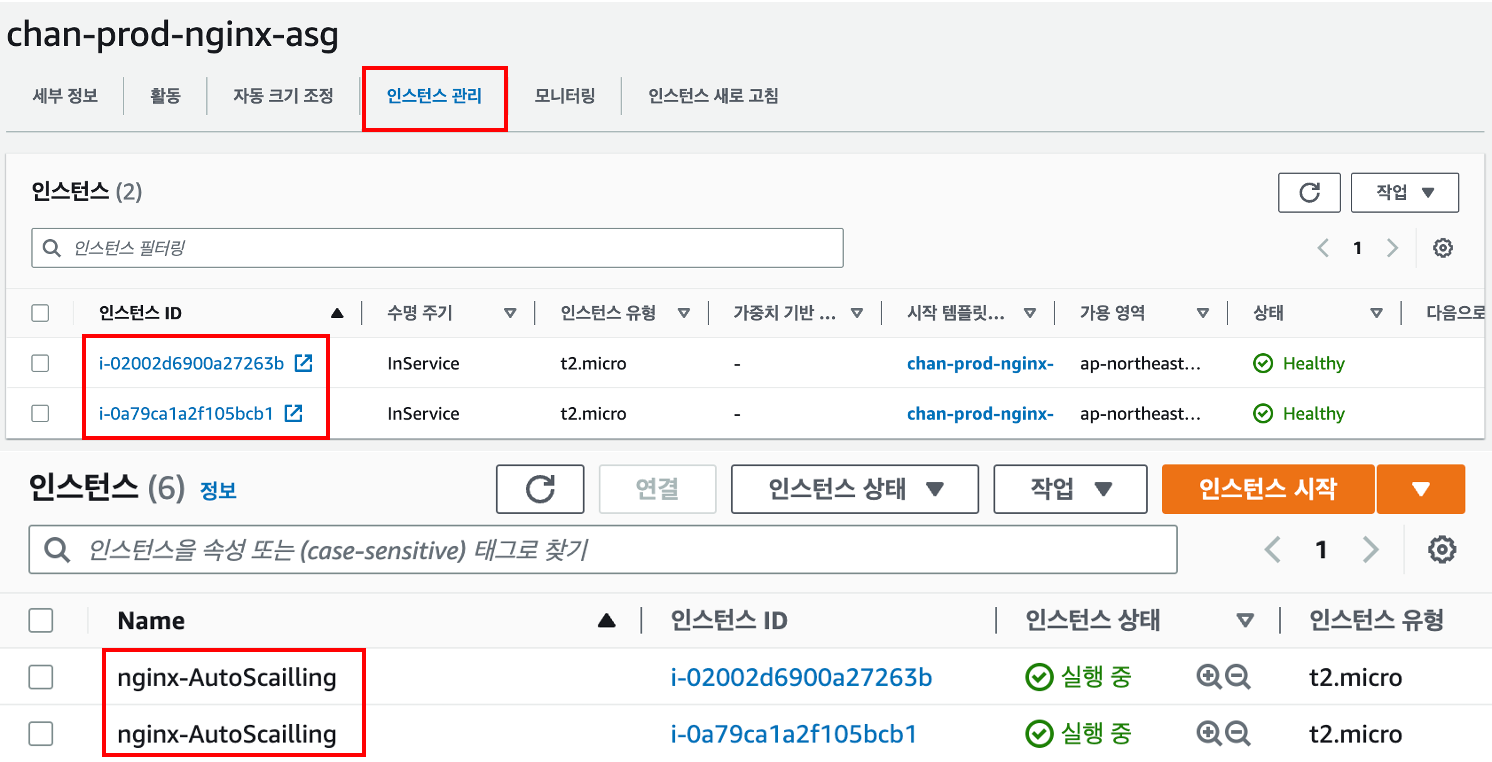 EC2 메뉴에서도 Auto Scaling 그룹에 의해 생성된 인스턴스를 볼 수 있고 Name 태그를 기반으로 인스턴스 이름도 자동으로 붙여진 모습을 볼 수 있습니다.