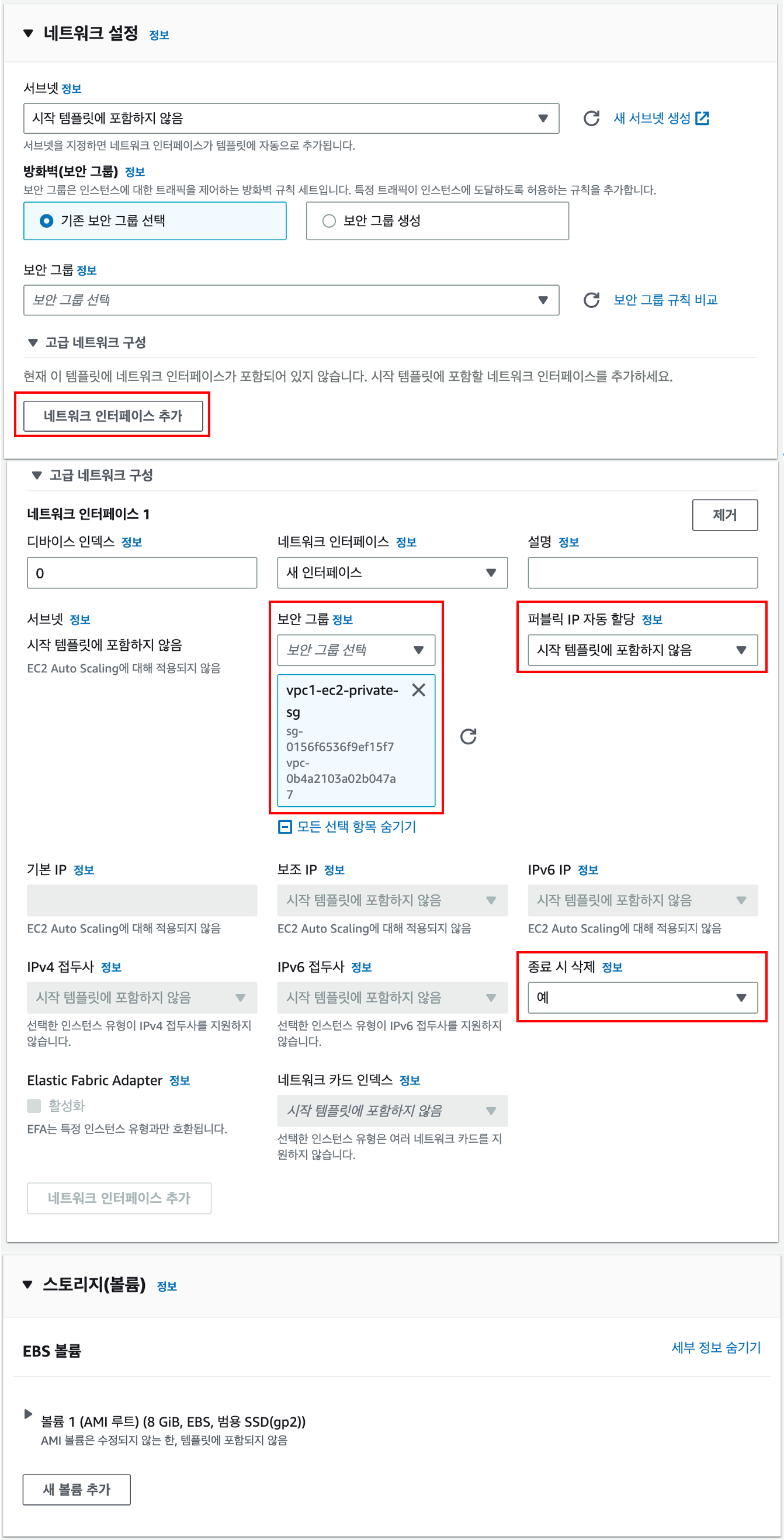 네트워크 설정의 서브넷은 Auto Scaling 생성 시 네트워크를 지정하기에 시작템플릿에는 포함하지 않습니다.