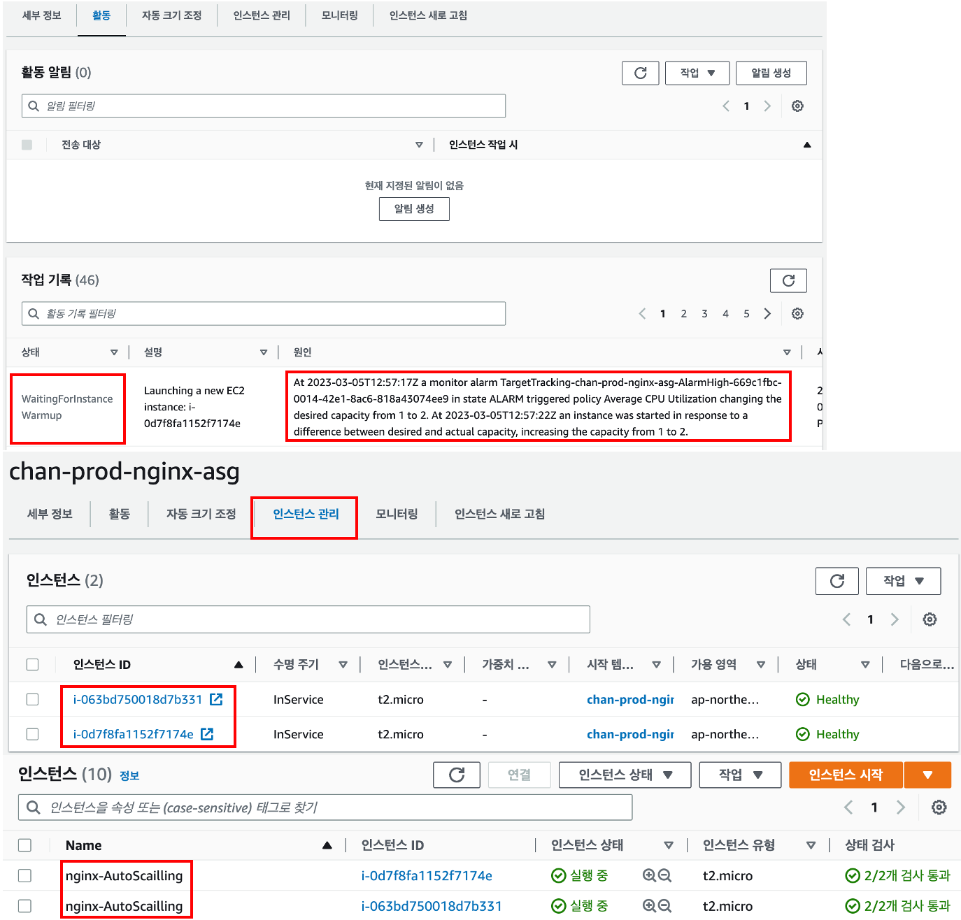 인스턴스 증가가 완료되면 자동으로 1대 -> 2대로 증가된 것을 확인 할 수 있습니다.
