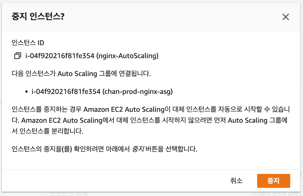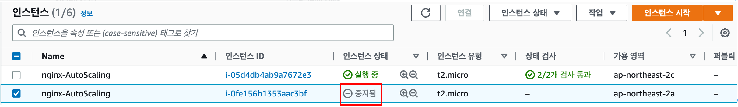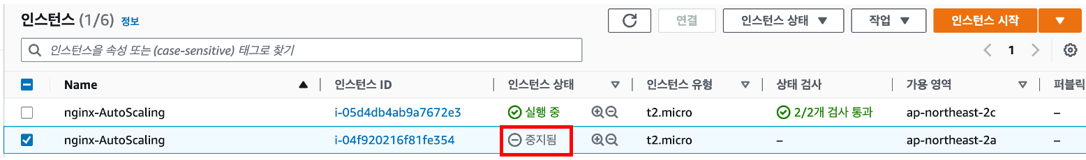 인스턴스를 중지 시켜 Auto Scaling 헬스체크 실패 시 동작을 보려고 합니다.
