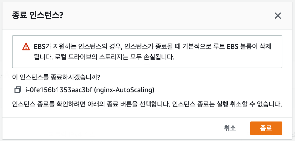 그런데 중지한 인스턴스를 종료 시키면 Auto Scaling 동작이 다시 이루어질까 하는 궁금증이 생겨 종료해 봤습니다.