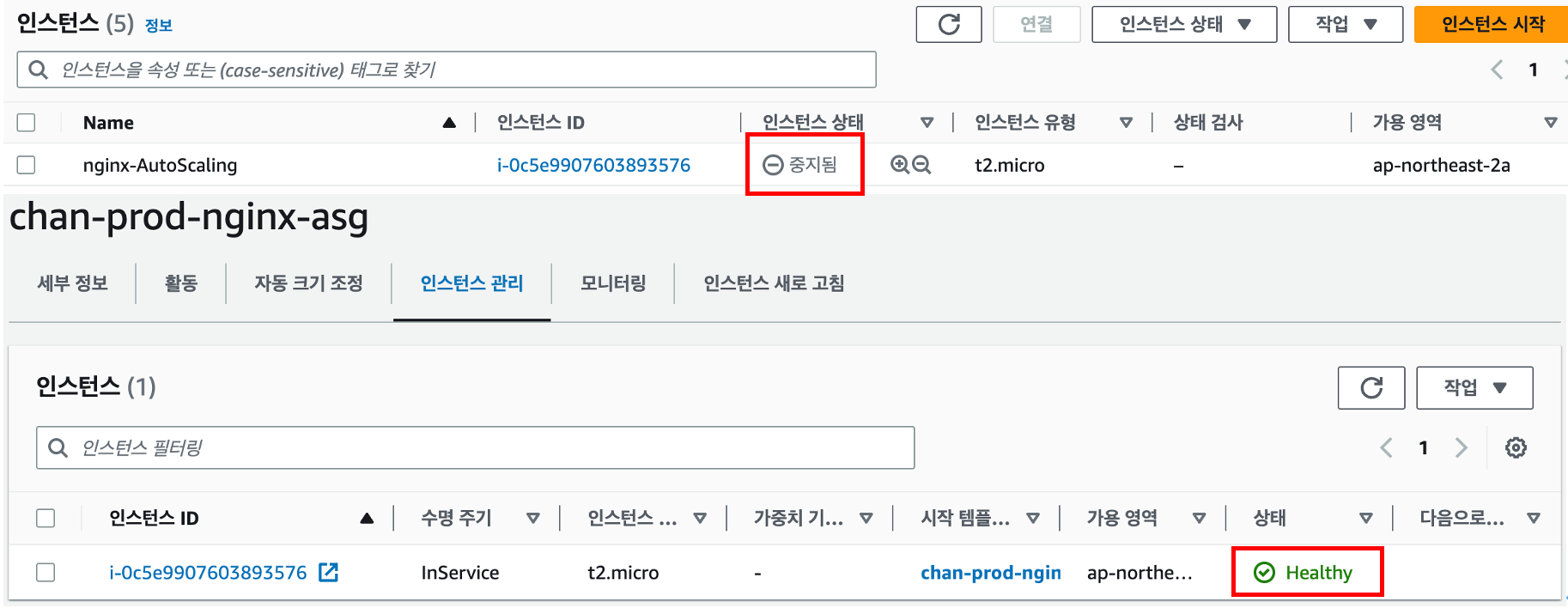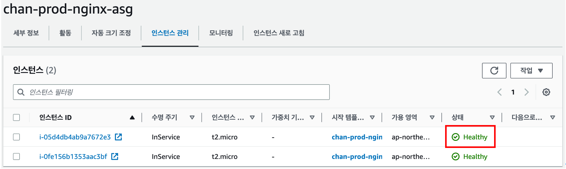 분리 후 비정상 인스턴스는 제거 되었고 잠시 후 원하는 용량 설정에 인스턴스 개수를 2개로 맞추기 위해 하나의 인스턴스가 새로 생성되었습니다.