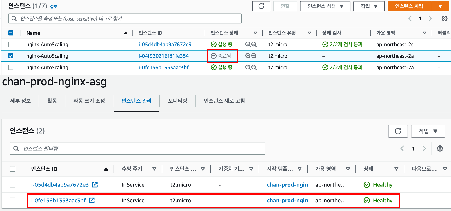 인스턴스가 중지 된 것을 감지하고 헬스체크가 실패되어 비정상으로 판단하게 됩니다. 그에 따라 중지된 인스턴스는 다른 인스턴스로 교체되었습니다.