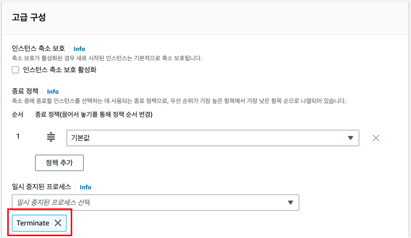 이렇게 Terminate 프로세스를 중지 시키면 Auto Scaling 동작이 정상적으로 수행되지 않을 수 있으니 주의해야합니다.
