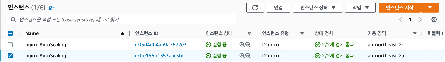 현재 인스턴스 상황으로 Auto Scaling에 의해 2대의 인스턴스가 관리되고 있습니다.