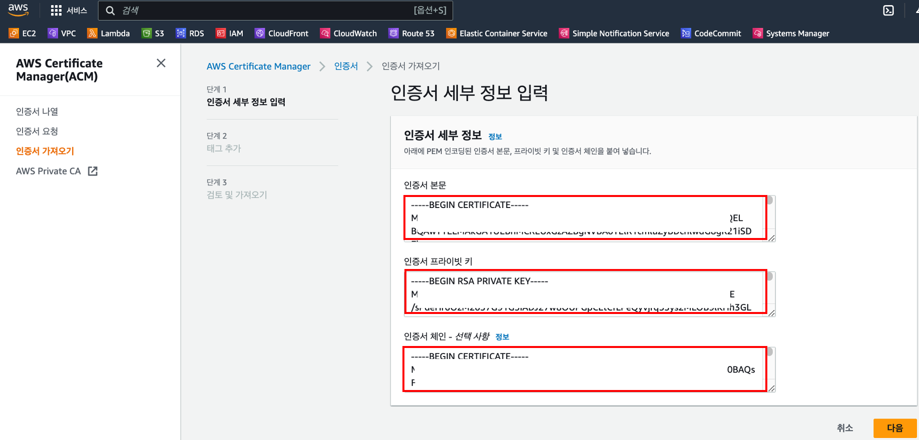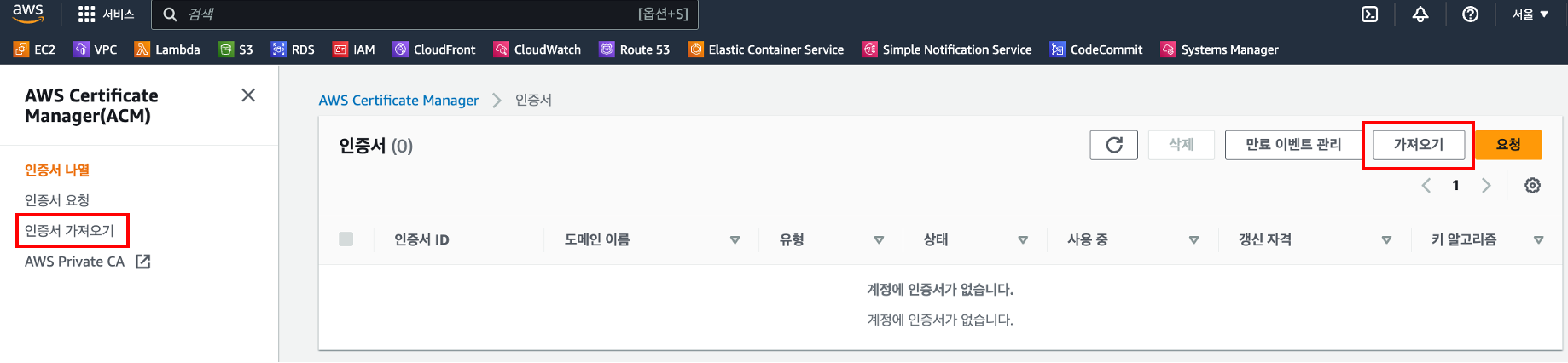 발급받은 인증서 파일을 AWS에 등록하기 위해서는 AWS Certificate Manager 서비스로 진입합니다.
