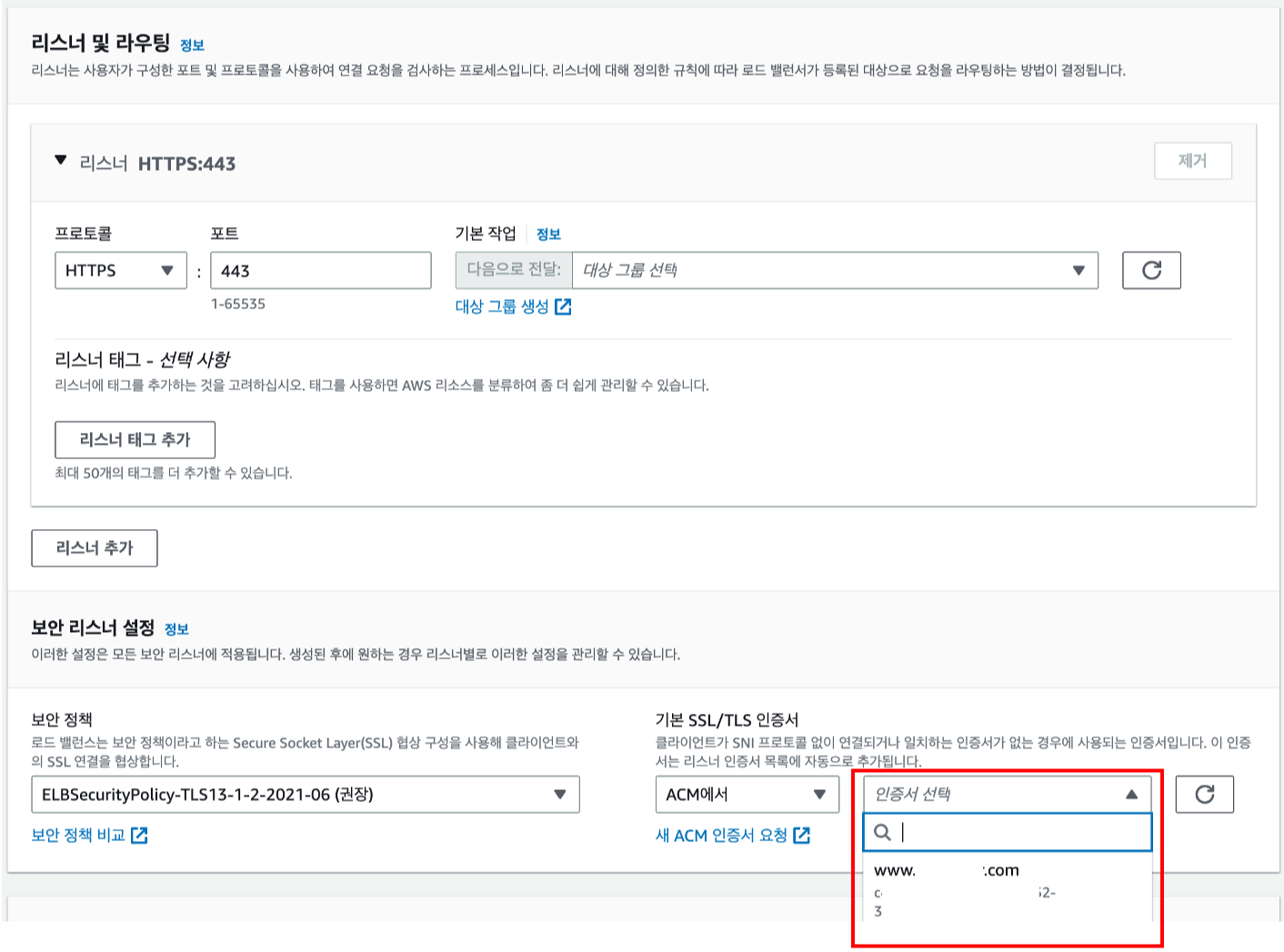 등록한 인증서는 로드밸런서의 HTTPS 리스너에서 SSL 인증서 선택 시 사용할 수 있습니다.