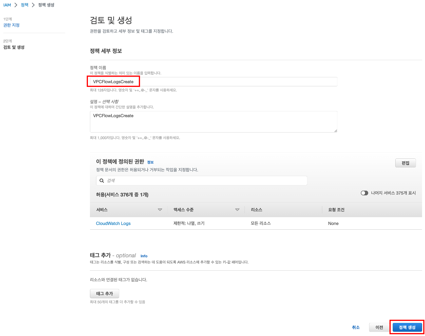 정책 이름을 작성 후 정책 생성을 마무리 합니다.