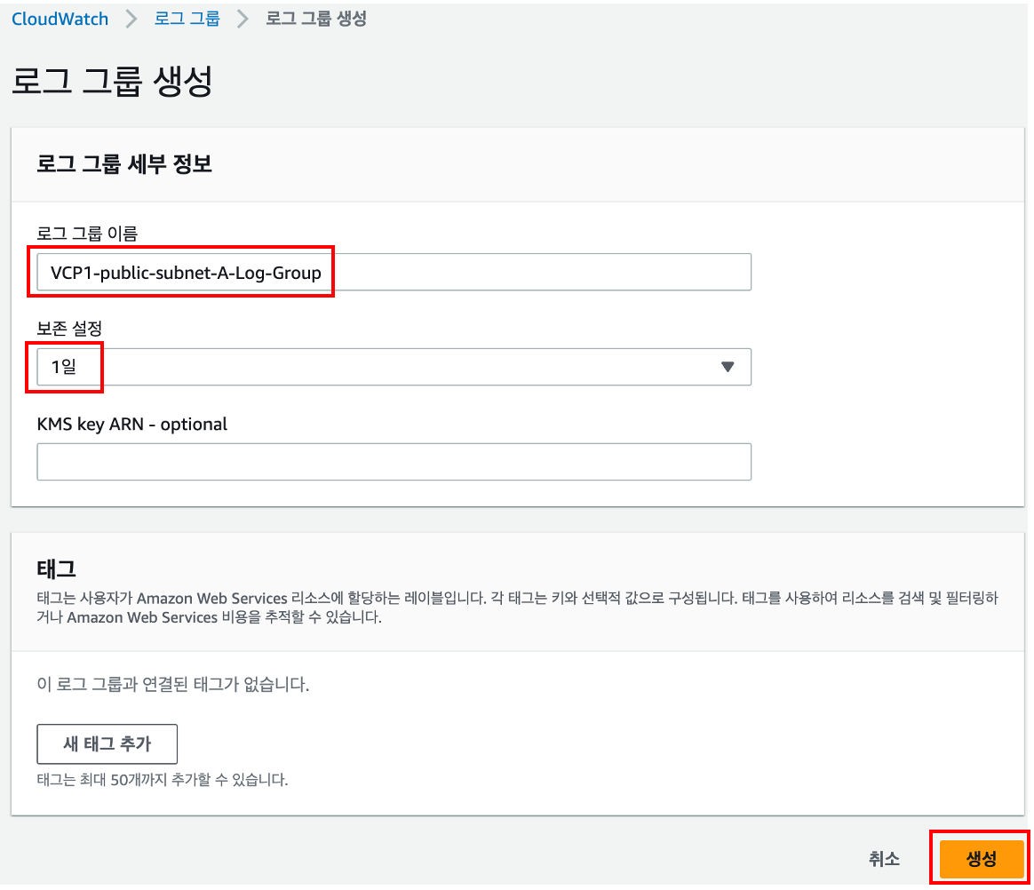 로그 그룹의 이름과 로그 보관 기간을 설정하면 생성이 완료됩니다.