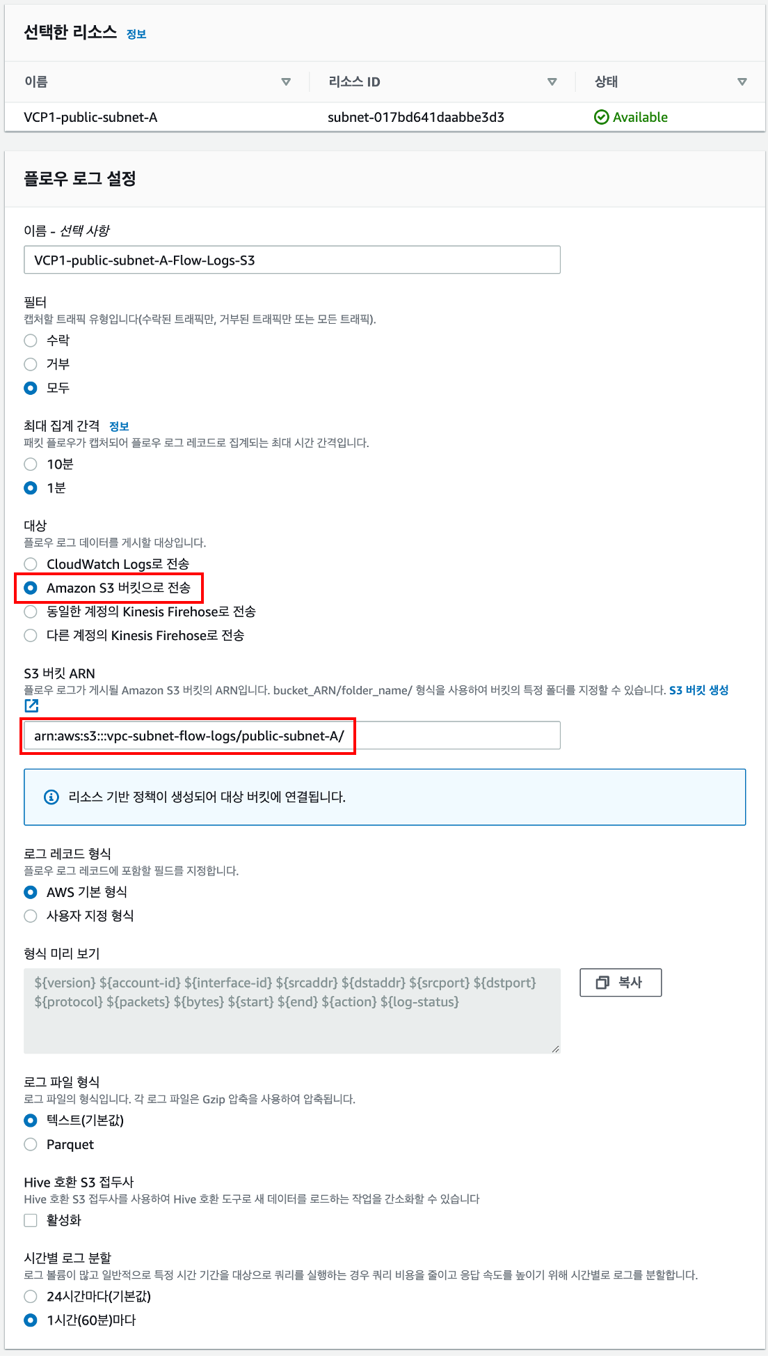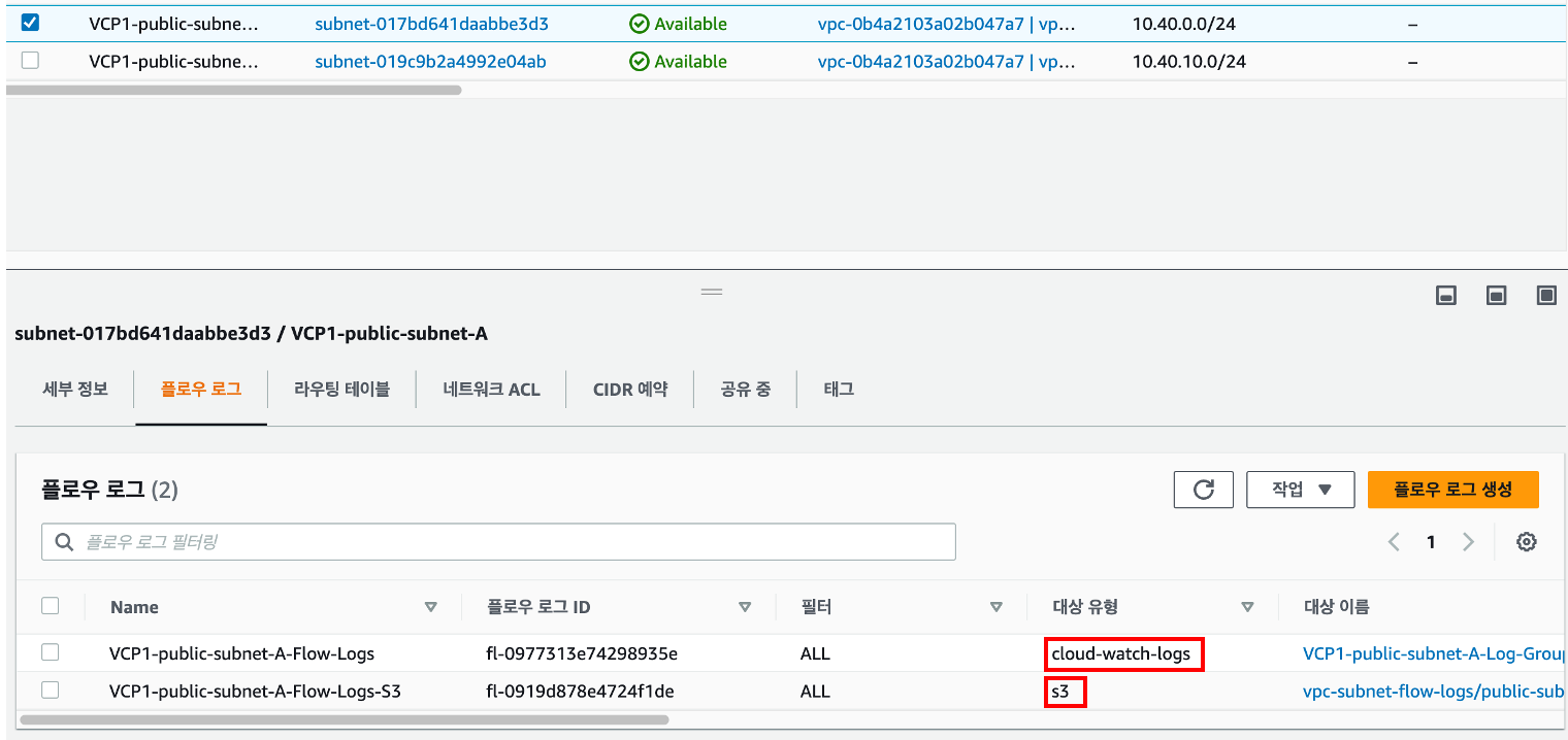 Flow logs를 생성 후 대상 유형에 따라 생성 로그를 CloudWatch Logs로 보내는지 S3로 보내는지 알 수 있습니다.