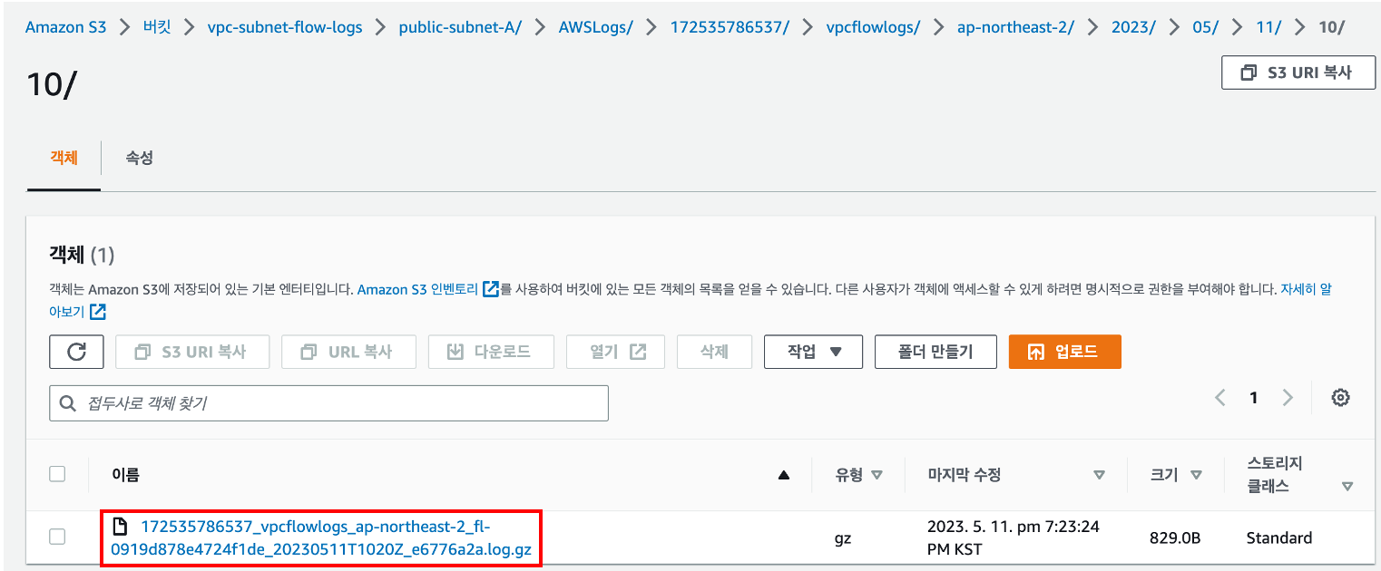 CloudWatch Logs와 마찬가지로 Flow logs 설정 후 지정한 S3 버킷에 들어가보면 로그가 저장되어 있습니다.