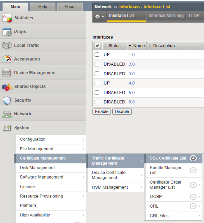 1. System → Certificate Management → Traffic Certificate Management → SSL Certificate List 인증서 등록 메뉴 진입