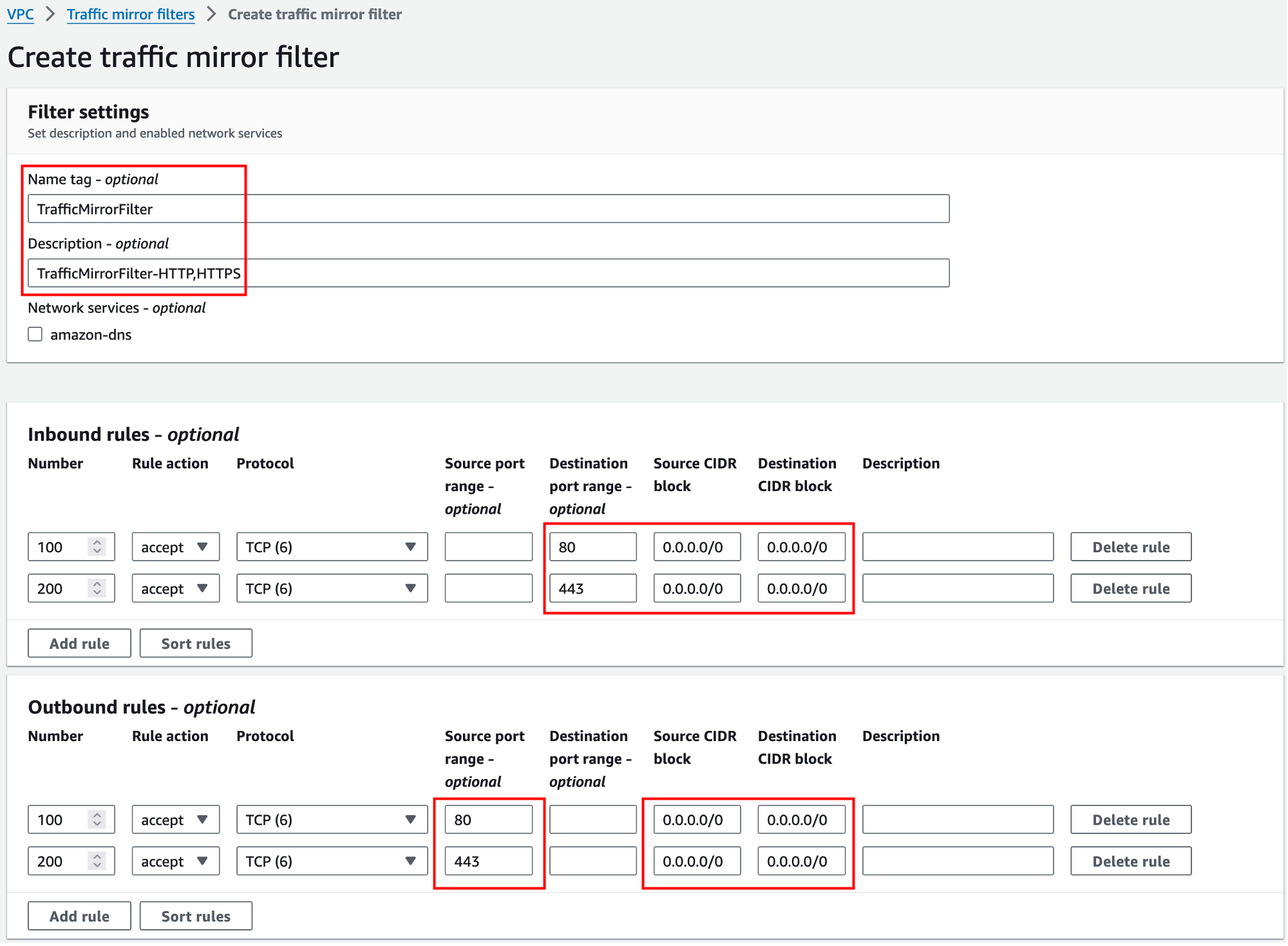 Filter는 Inbound, Outbound Rule을 정할 수 있으며 In/Outbound 80,443 포트만 필터링 되도록 설정했습니다.