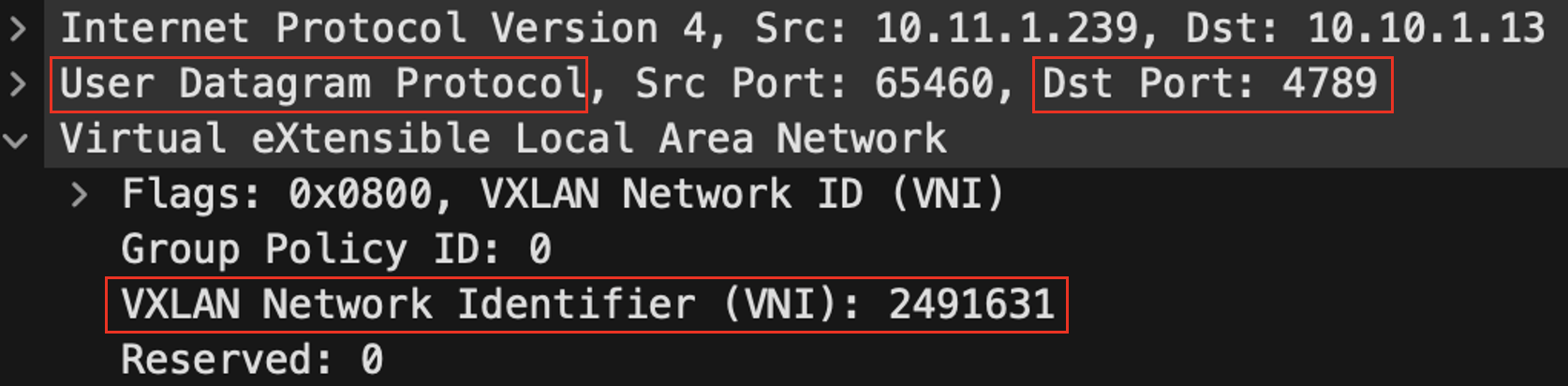 VXLAN 패킷 확인 시 UDP 4789 번호 및 VNI 번호를 확인 할 수 있습니다.