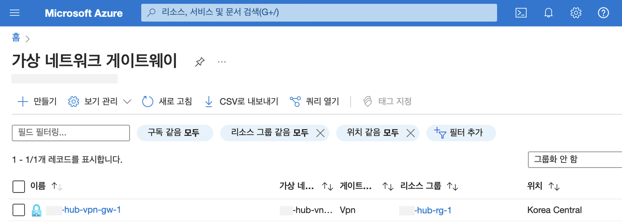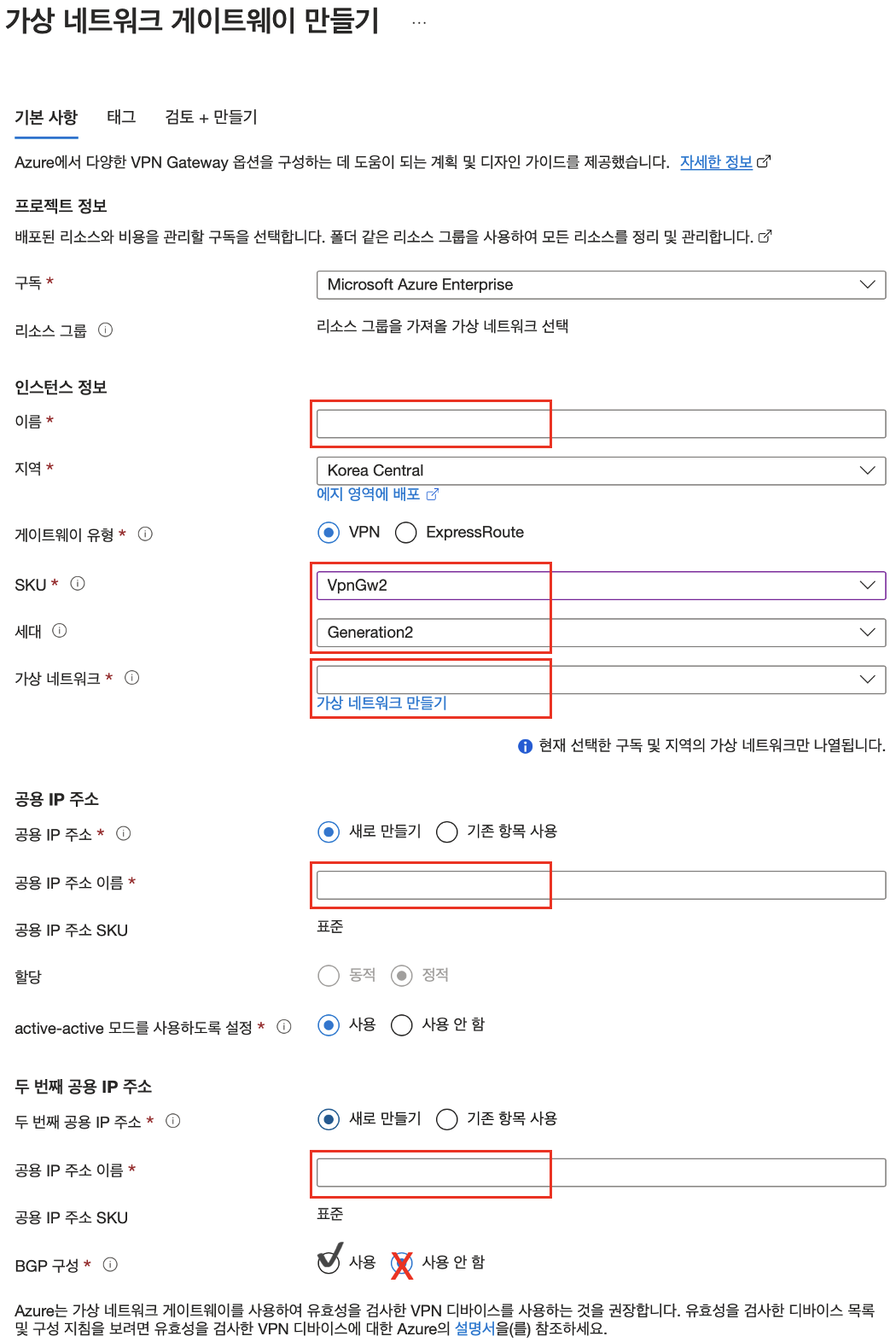 만들기 버튼을 눌러 새로운 가상 네트워크 게이트웨이 생성합니다.