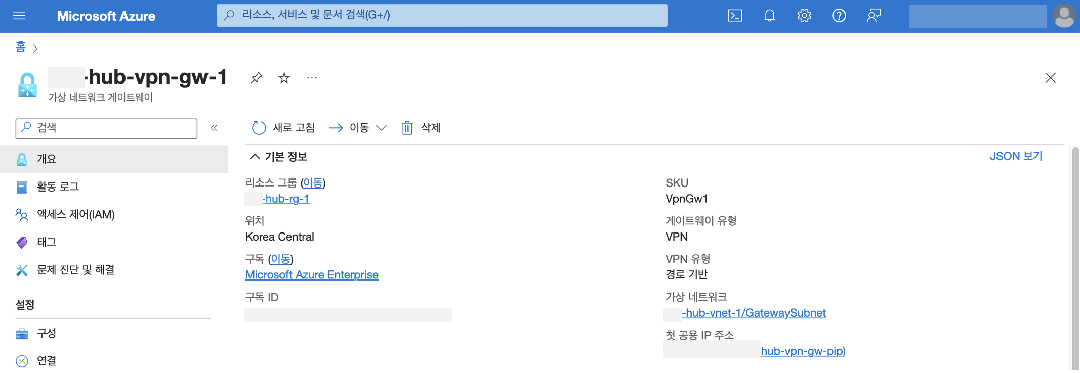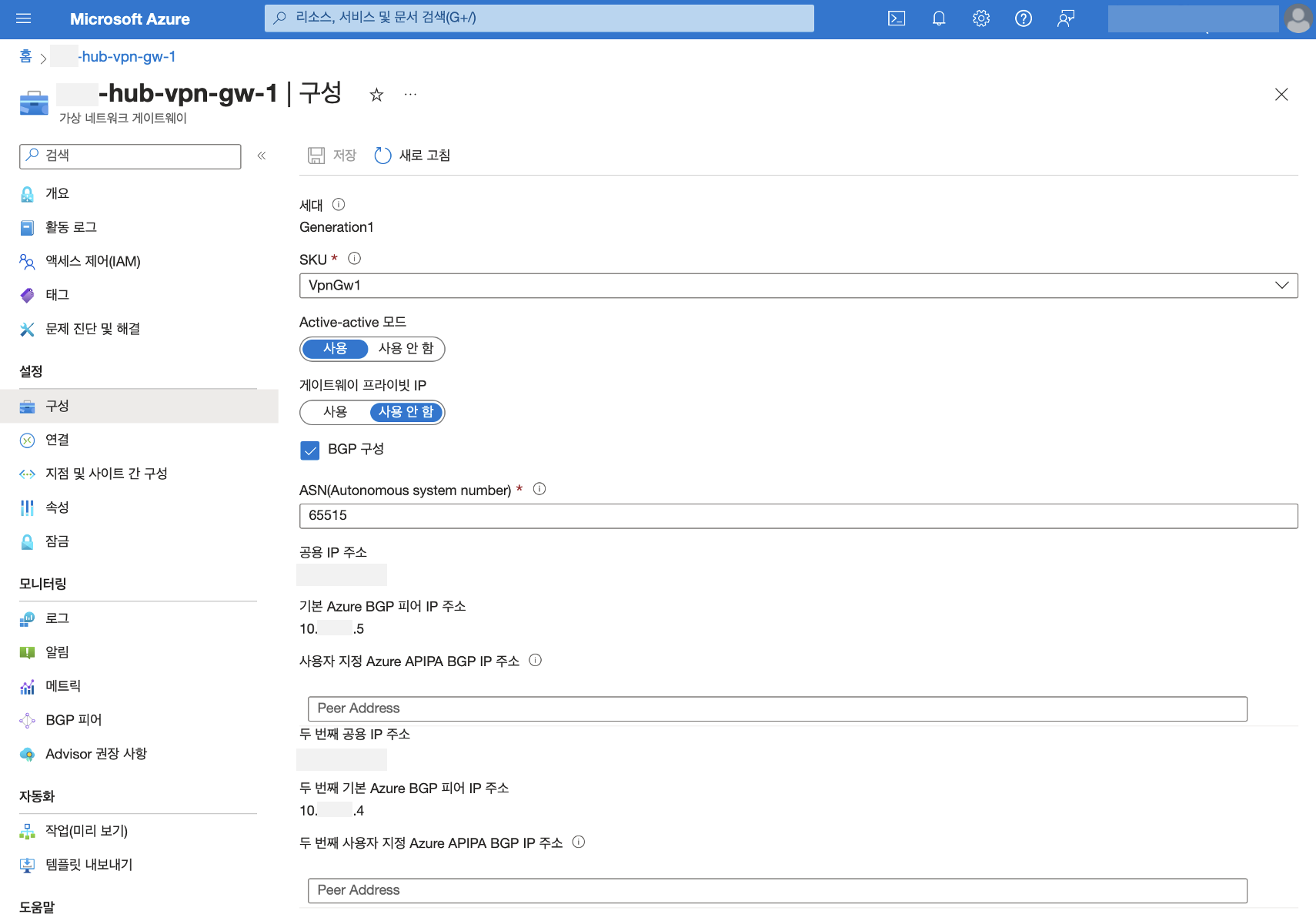 게이트웨이 이름을 작성하고 유형(SKU/세대), vnet(가상 네트워크)을 선택합니다.