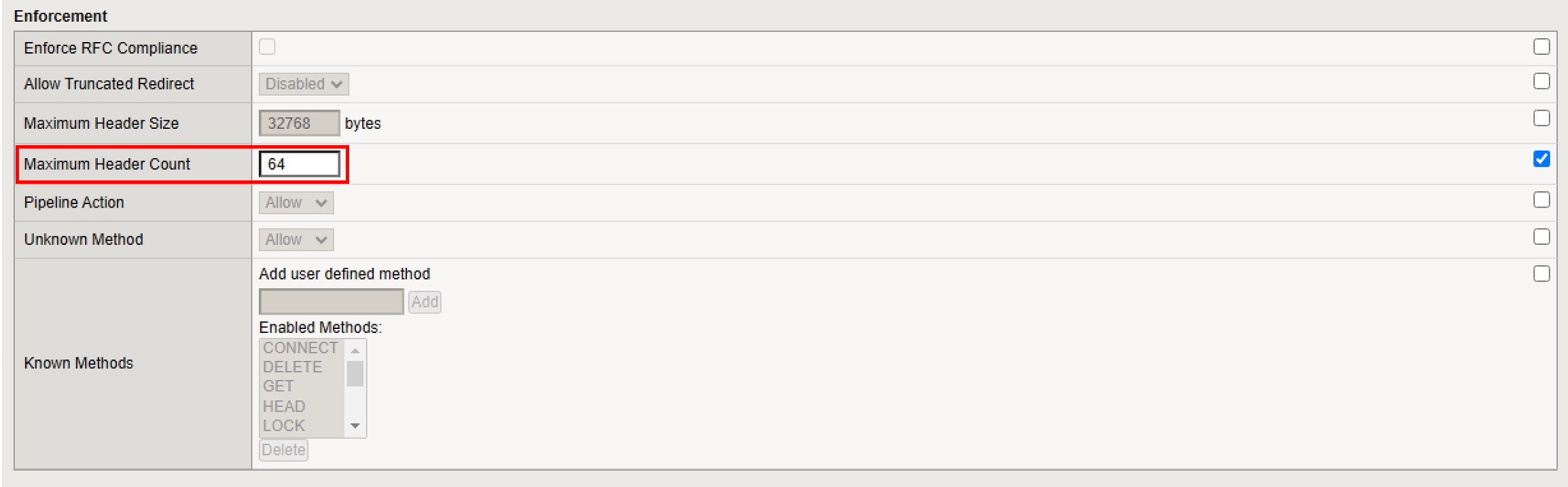 Maximum Header Count 옵션으로 헤더 개수가 64개로 제한되어 있었습니다. HTTP 헤더에는 curl로 생성한 헤더 외에도 host, agent 등 기본 정보가 포함되어 있어, 59개부터 문제가 발생했던 것입니다.