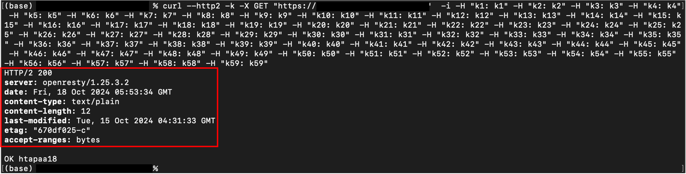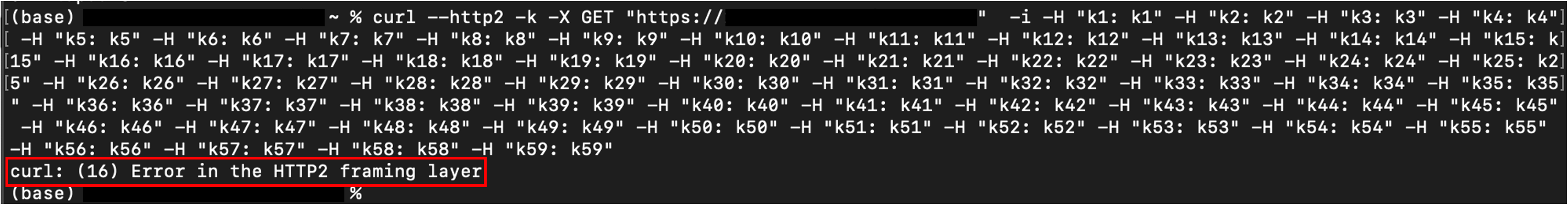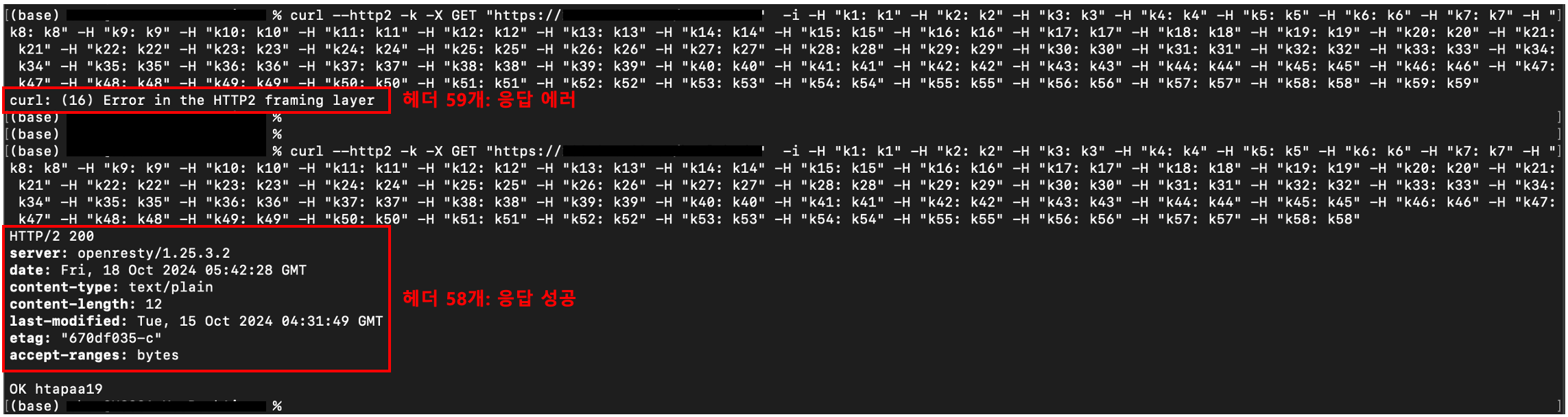 curl 명령어로 헤더를 하나씩 추가해 테스트를 진행했고, 헤더 개수가 58개까지는 정상적으로 성공했으나 59개부터 에러가 발생하는 것을 알 수 있었습니다.