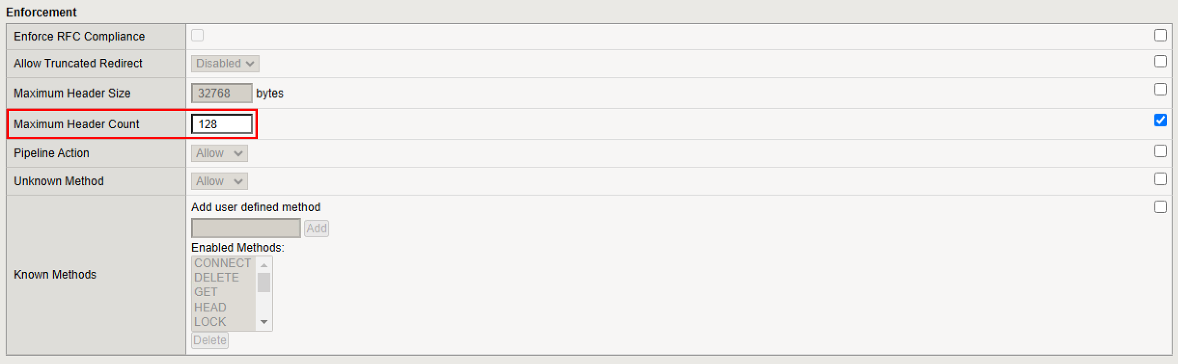 에러 발생을 확인한 후, HTTP Profile에 설정된 헤더 개수 제한을 확인했습니다.