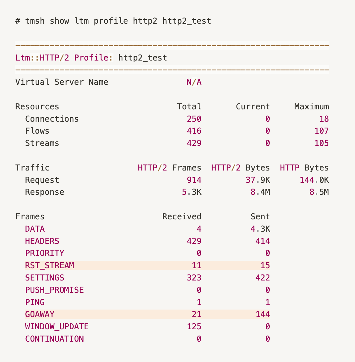 이를 바탕으로 현재 적용된 HTTP/2 프로필을 확인해보니, 실제로 RST_STREAM, GOAWAY 에러가 발생했음을 확인할 수 있었습니다.