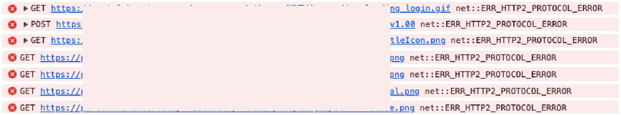 브라우저 개발자 모드로 확인해보니 ERR_HTTP2_PROTOCOL_ERROR 에러가 발생하고 있었습니다. 이에 따라 HTTP/2 적용을 롤백하고 원인을 파악해야 했습니다.