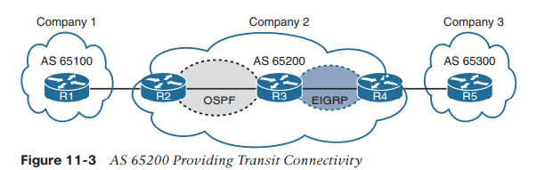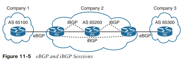 Company2와 같이 동일 AS내에서는 EIGRP, OSFP와 같은 IGP를 이용해 라우팅 정보를 교환합니다. IGP로 얻은 라우팅 정보로 BGP 라우팅 정보를 교환합니다. R3은 IGP만으로도 라우팅 정보 교환이 가능하지만 R2, R4가 얻은 eBGP 경로 정보를 안정적으로 교환하기 위해 iBGP 관계를 맺습니다.