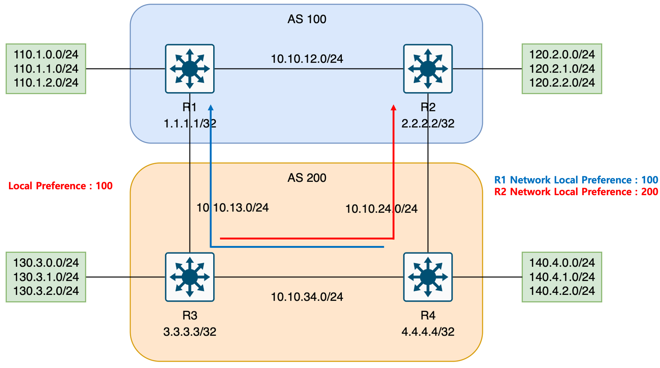 R4의 Local Preference 속성 값을 Default 100에서 200으로 높여 우선 순위를 갖도록 합니다.