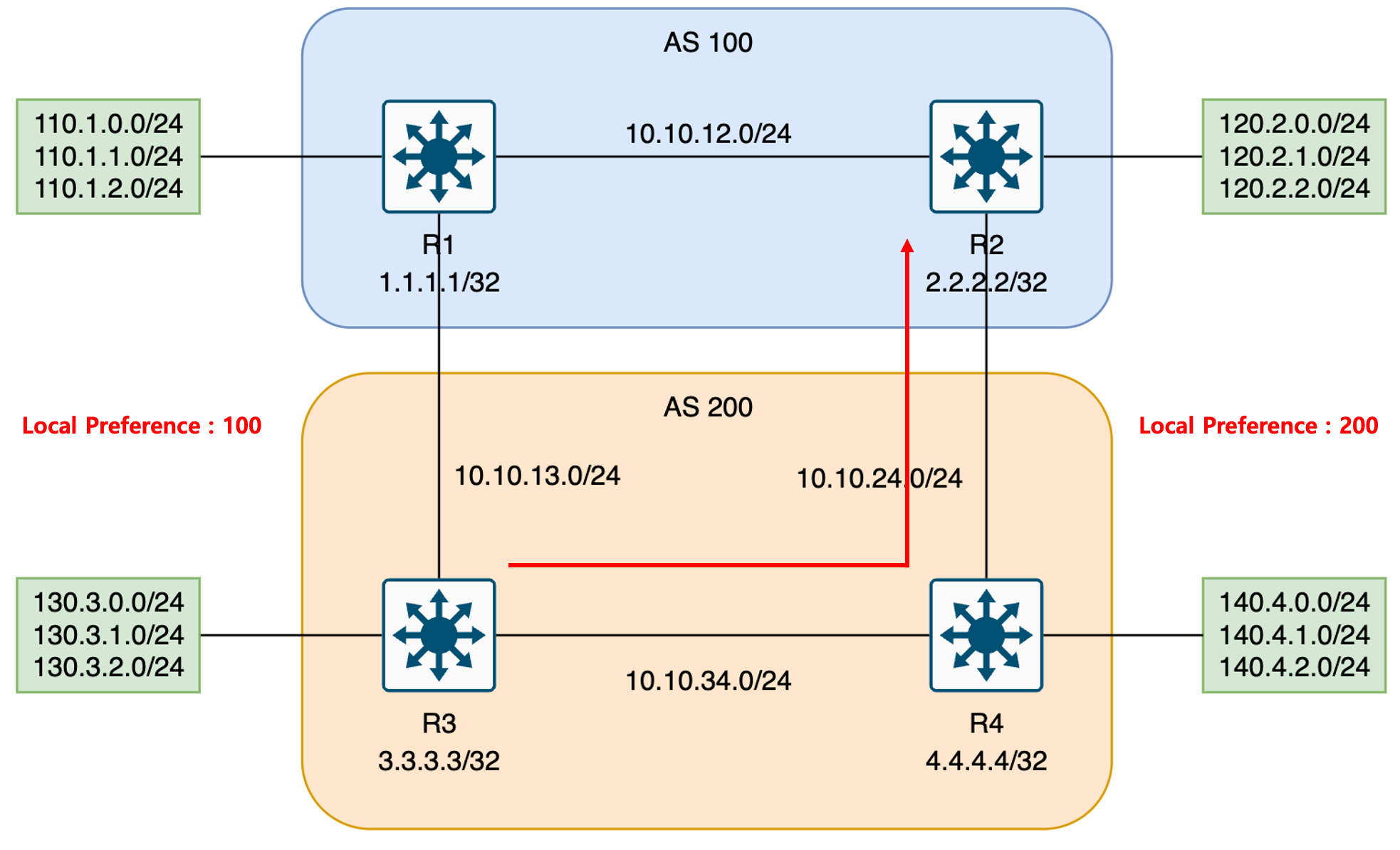 Local Preference 속성 적용 전 AS 외부로 가는 경로는 경로 우선순위 결정에 의해 각각 전달받은 eBGP 경로로 전달합니다. (R3 → R1 / R4 → R2)