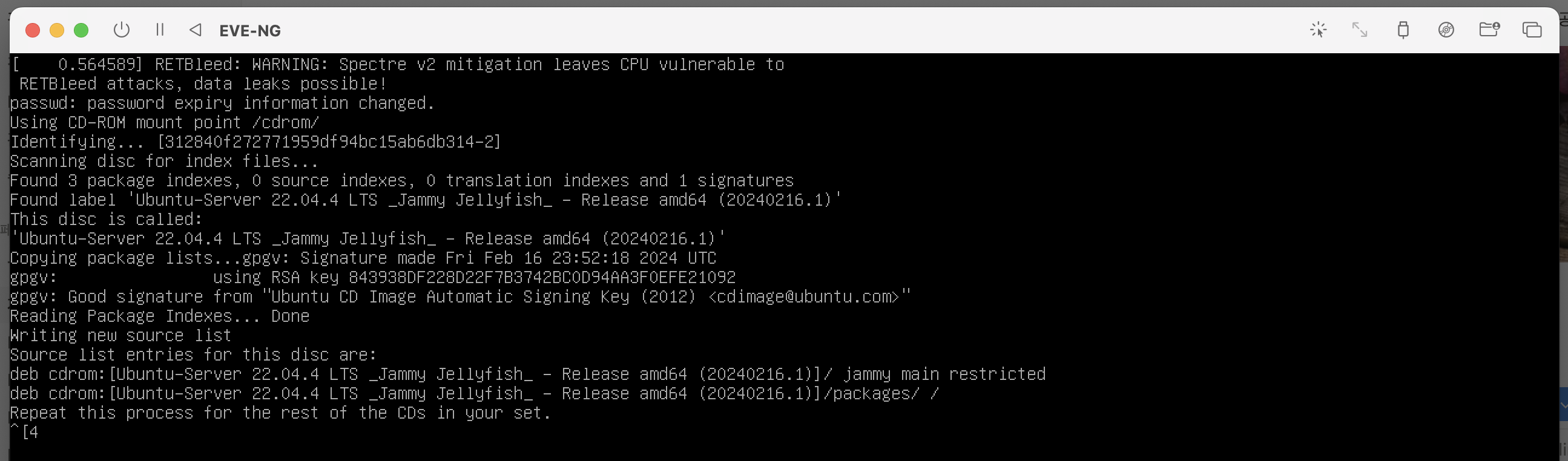 이전과 같이 셋팅 화면이 안뜨고 부팅화면이 뜨면서 eve-ng를 실행하기 위한 환경 및 각종 파일들이 설치됩니다.