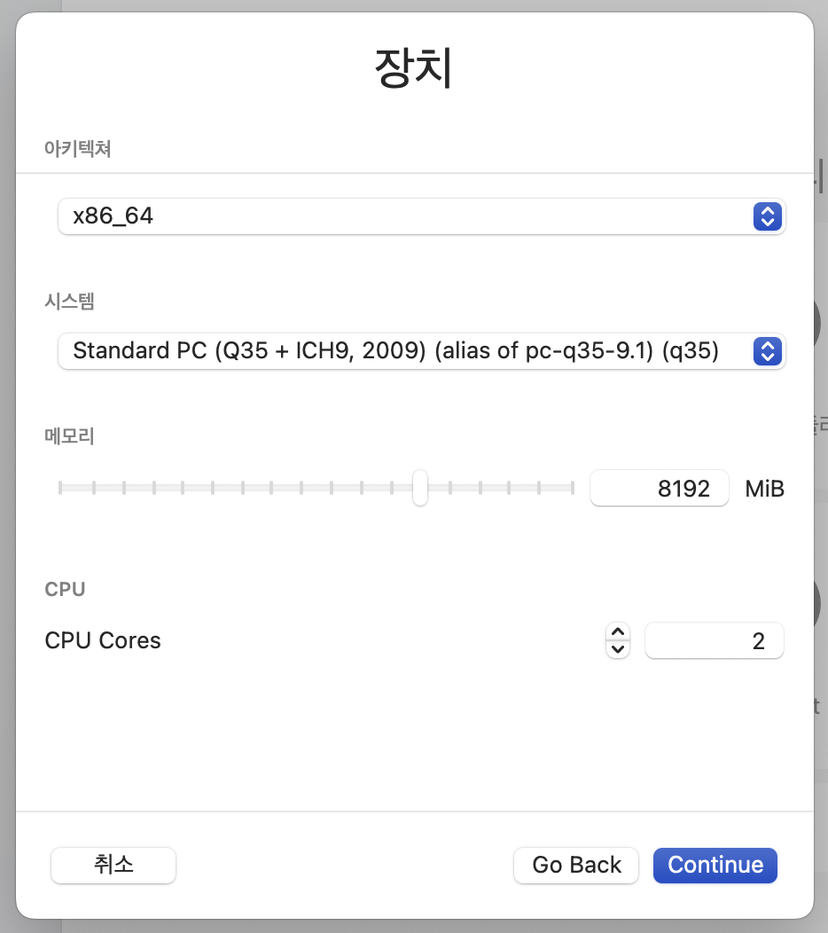 재부팅이 진행되었다면 VM을 종료하고 UTM에서 VM옵션을 변경합니다.