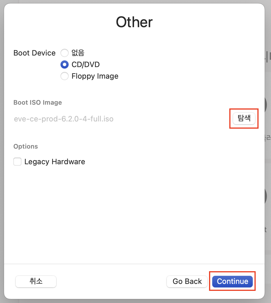 운영체제 Other → CD/DVD → 탐색 → IOS 이미지 선택 후 다음 단계로 넘어갑니다.