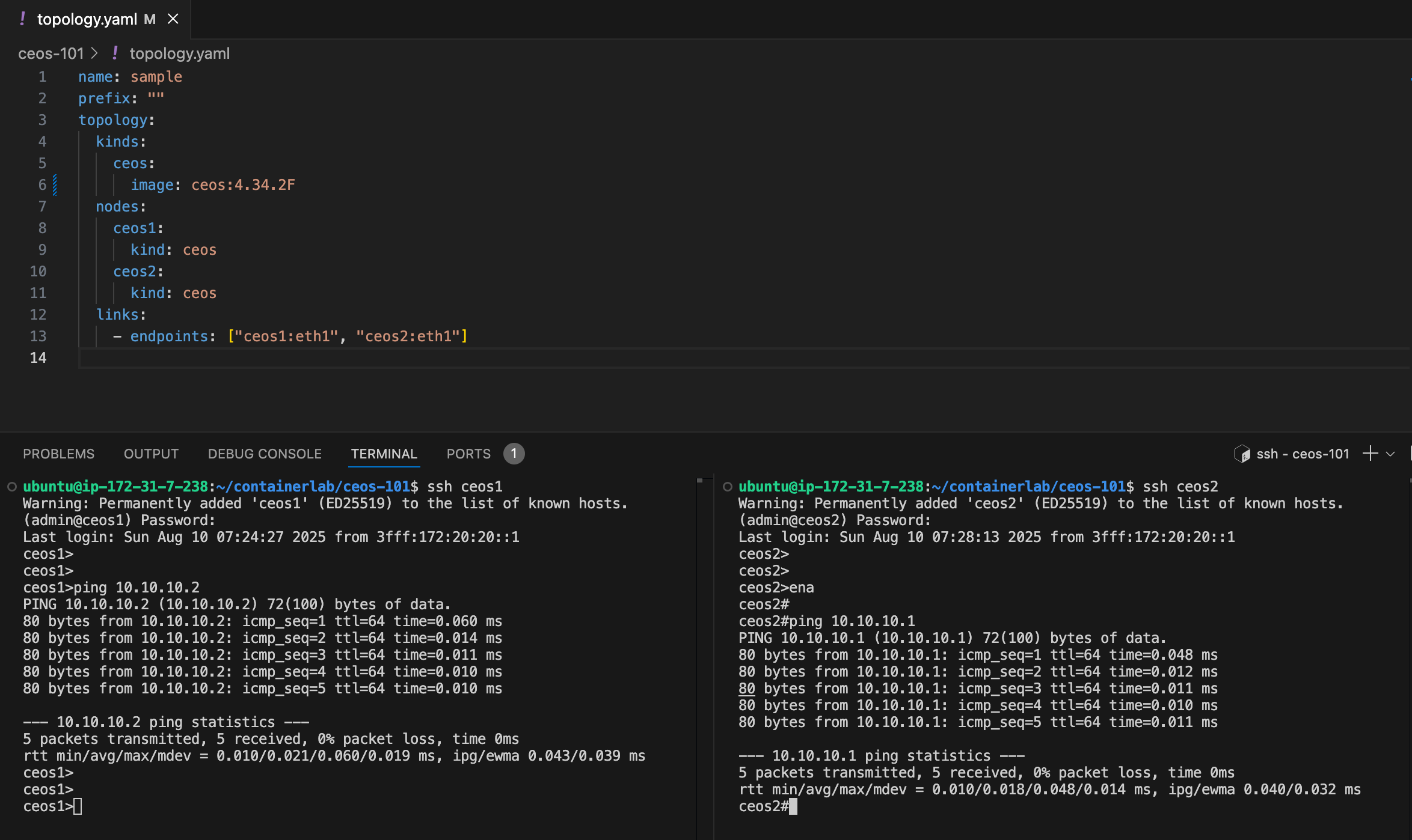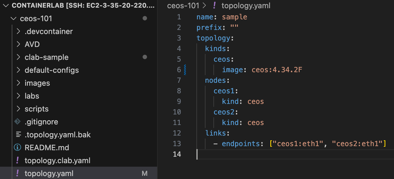 - `topology.links`: ceos1:eth1 ↔ ceos2:eth1 인터페이스를 연결합니다.
