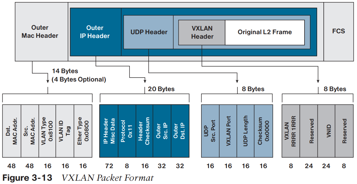 VXLAN은 기존 이더넷 프레임을 캡슐화 구조(Encapsulation) 로 감싸서 Underlay 네트워크 위에서 전송하는 데 있으며, 이 과정에서 VXLAN Header, UDP Header, IP Header 등이 추가되어 원래의 프레임이 목적지까지 전달됩니다.