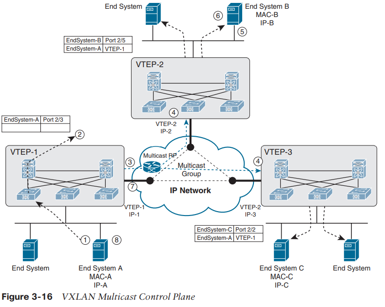 - Multicast Group에 참여한 모든 Remote VTEP들은 패킷을 수신하고, 캡슐화 해제 후 End System의 MAC 주소와 원본 VTEP 정보를 학습합니다.