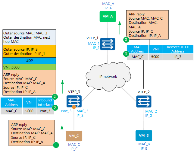 - 응답(ARP Reply 등)은 Unicast로 전달되어, VTEP 간 MAC → VTEP IP 매핑이 완성됩니다.