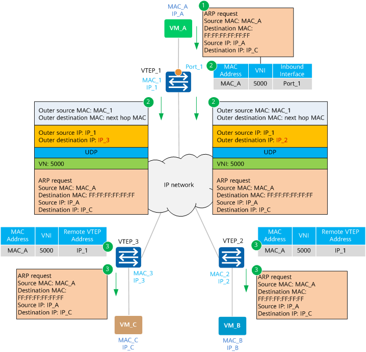 - 목적지 MAC이 없을 경우, BUM 트래픽(예: ARP 요청)을 VXLAN 캡슐화하여 해당 VNI에 매핑된 Multicast Group으로 전송합니다.