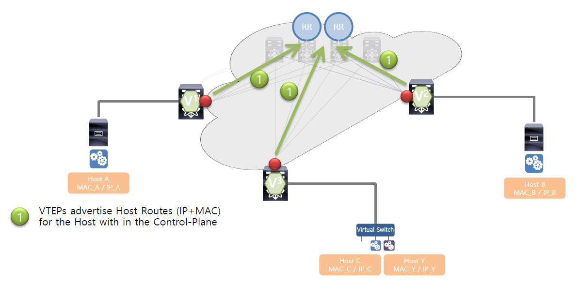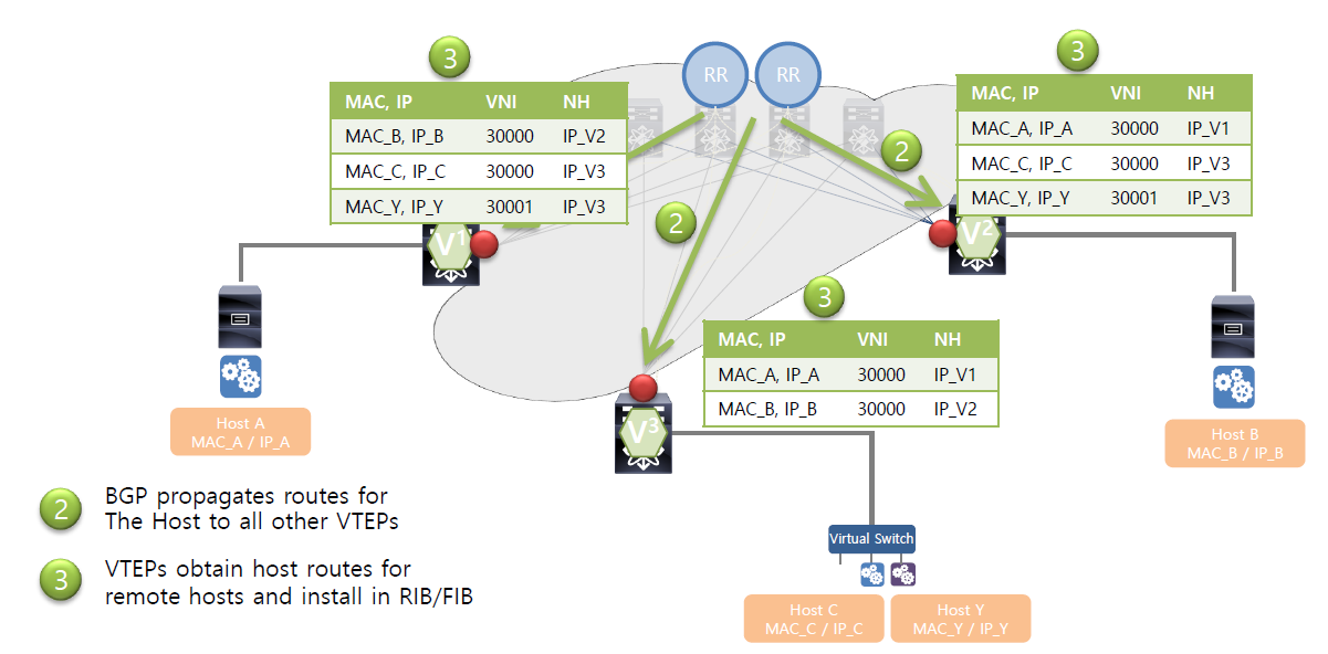 - 각 VTEP은 자신의 MAC, IP, VNI 정보를 MP-BGP EVPN을 통해 Route Reflector(RR) 에 광고합니다.