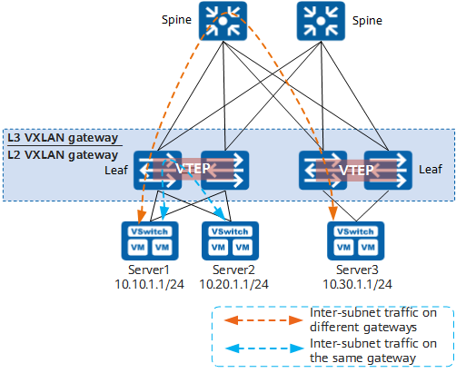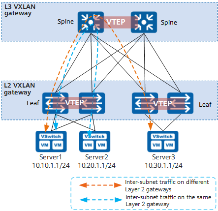 분산형 VXLAN 게이트웨이를 구축하면 중앙 집중형 VXLAN 게이트웨이 구축의 문제점을 해결할 수 있습니다.