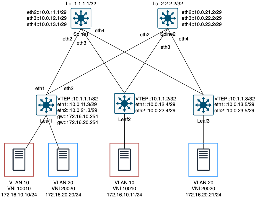 - 목적: 같은 서브넷에 있는 VM/서버들을, Leaf 스위치 간 VXLAN 캡슐화를 통해 Layer2 브로드캐스트 도메인처럼 연결.