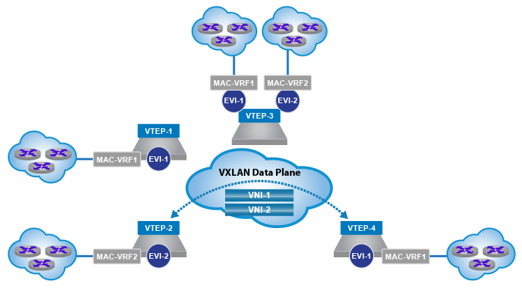 - MAC 주소 기반의 가상 포워딩 테이블로, 각각의 MAC-VRF는 특정 EVPN 인스턴스(EVI)에 연결되어 Layer 2 브리지 도메인을 분리합니다.