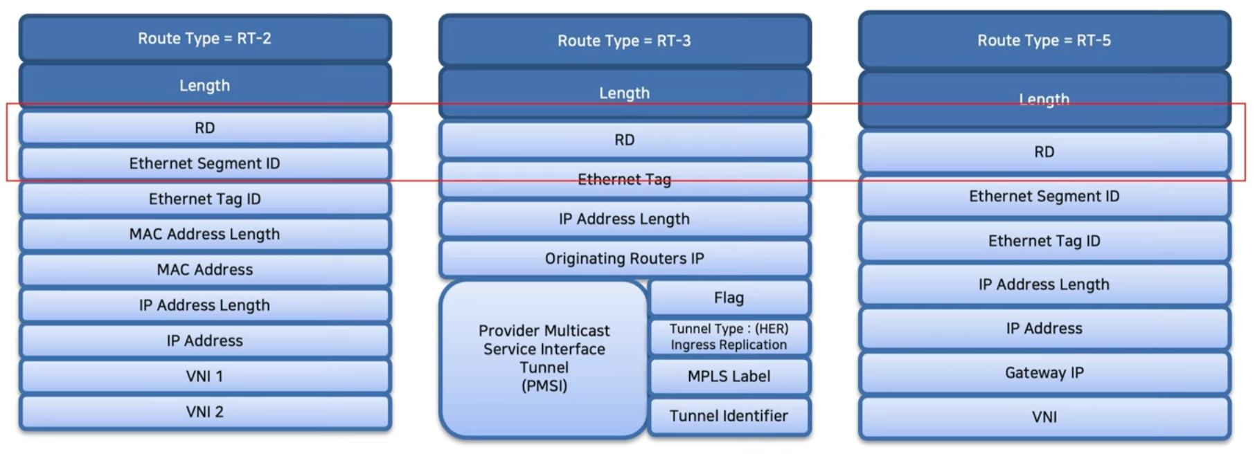 - EVPN에서 MP-BGP를 통해 전송되는 MAC/IP 경로에는 `RD + RT` 가 붙습니다.