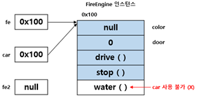 참조변수 fe가 참조하고 있는 인스턴스를 참조변수 car가 참조하도록 한다. 이때 두 참조변수 타입이 다르므로 참조변수 fe가 형변환 되어야 하지만 생략되었다. 참조변수 car을 통해서도 FireEngine인스턴스를 사용할 수 있지만, fe와 달리 car는 Car타입이므로 Car클래스의 멤버가 아닌 water()는 사용할 수 없다.