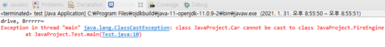 - 컴파일은 성공하지만 실행 시 fe=(FireEngine)car; 부분에서 에러가 발생한다. 조상타입의 참조변수를 자손타입의 참조변수로 형변환 한 것이라 문제가 없어 보이지만, 문제는 car이 참조하고 있는 인스턴스가 Car타입의 인스턴스인 것이다.
