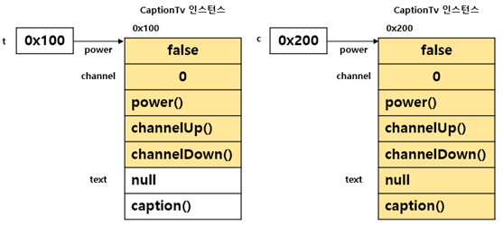 - Tv타입의 참조변수(t)로는 CaptionTv인스턴스 중 Tv클래스 멤버만 사용할 수 있다. (상속받은 멤버가 있다면 포함)