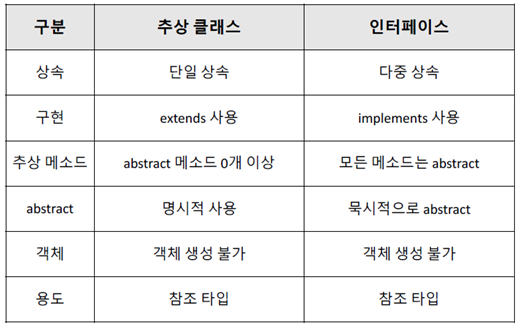 o 인터페이스는 추상클래스의 일종으로 추상클래스와 비슷하나 약간의 다른 점이 있다. 구현부를 갖춘 메서드 또는 멤버 변수를 멤버로 가질 수 없으며 오직 추상 메서드와 상수만을 멤버로 가질 수 있다.